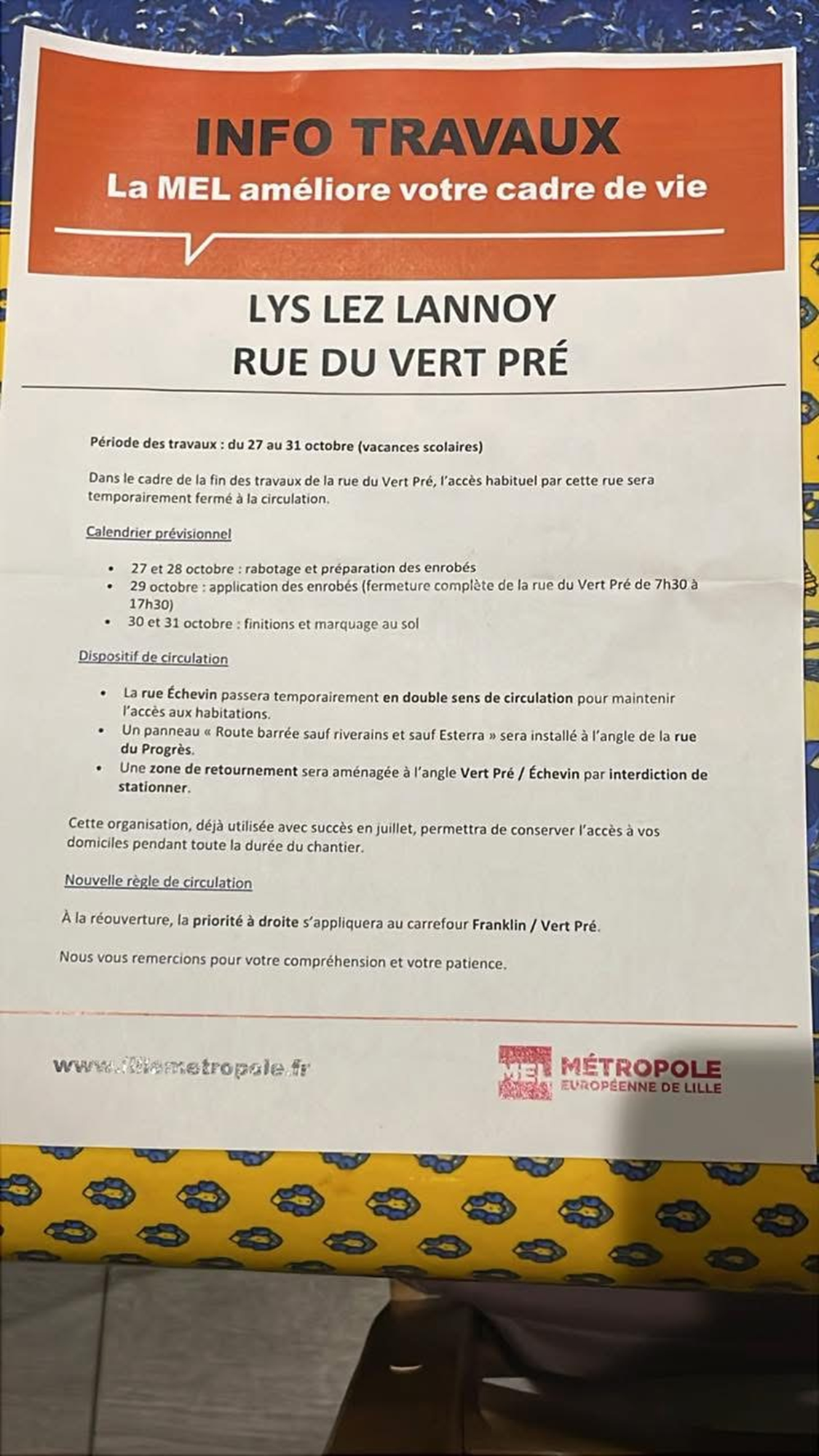 La rue du vert pré est fermée à partir d’aujourd’hui jusque vendredi soir 17:30.