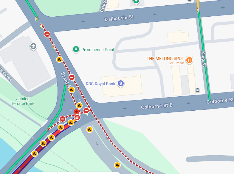When driving on Colborne Street East, exiting West Brant, over the Lorne Bridge. When you get to the intersection of Colborne & Brant Ave, Waze will tell you to turn LEFT onto Brant Ave, but the road is closed. No matter how many times I report a Lane closure/construction/hazard on the app, its not changing the status of the road closure, and keeps telling me to turn left at this intersection.
