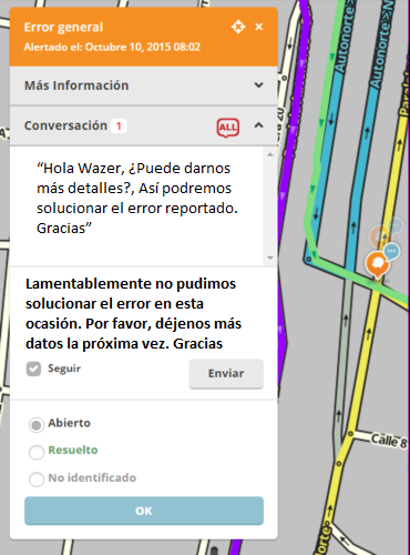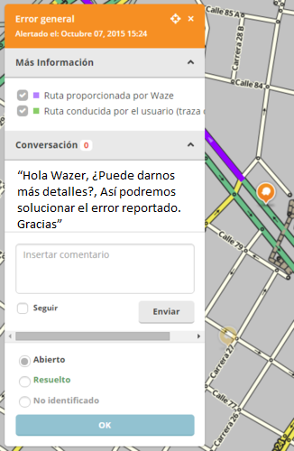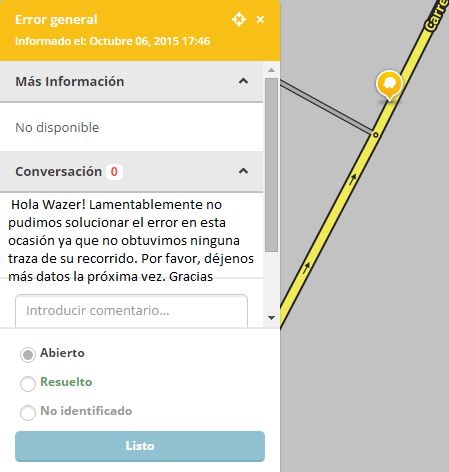 “¡Hola!, por favor deme mas información sobre su reporte. Nos ofrecemos como editores voluntarios de mapas y hacemos estos porque nos gusta. Por favor dígame donde comenzó su ruta y a donde se dirigía ya que el mapa no me da esa información. Necesitamos más información para solucionar su problema. Gracias por el informe. Si usted responde a mi pregunta y no le respondo dentro de 1 día, por favor envíeme un correo electrónico a xxxxxxxxx @ waze. com con una repetición de la información. Este informe se cerrará como “no identificado” si no hay respuesta dentro de los 7 días. Si quiere ser parte de nuestro grupo de editores, el email servirá para que lo invitemos. ¡Gracias!”.