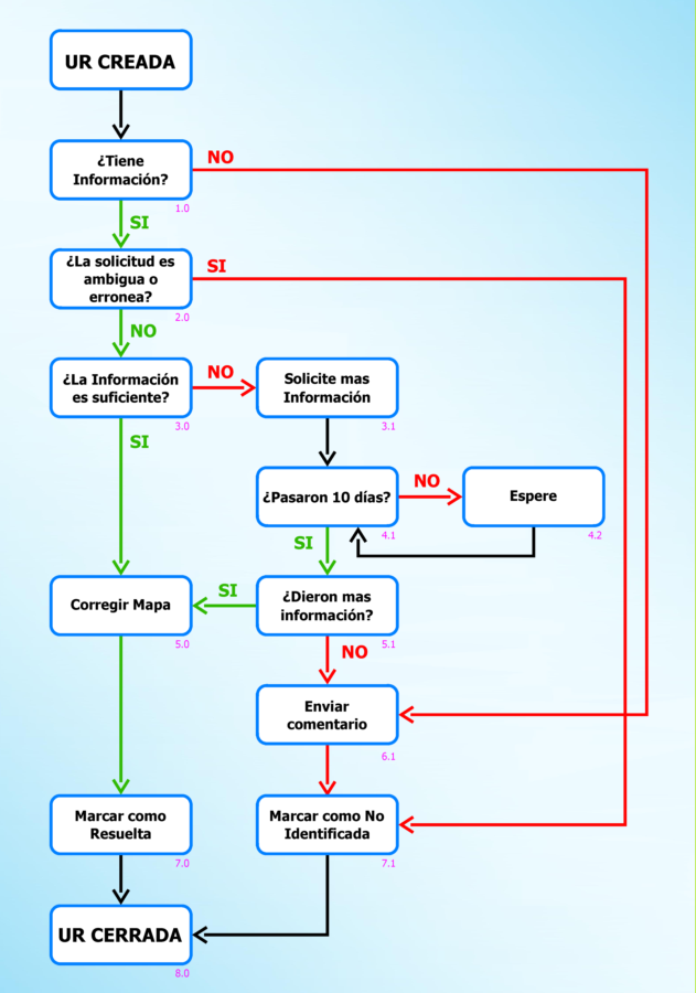 - 4.2 Si es necesario que ciertos UR tengan un tratamiento especial, se debe solicitar expresamente mediante un comentario en el mismo UR, dando la explicación suficiente, para que otros editores no lo cierren; sin embargo, el UR debe ser definido en un tiempo no mayor a 15 días después de su periodo de espera máxima para no llenar los mapas de datos innecesarios.