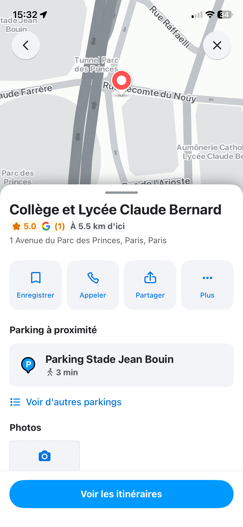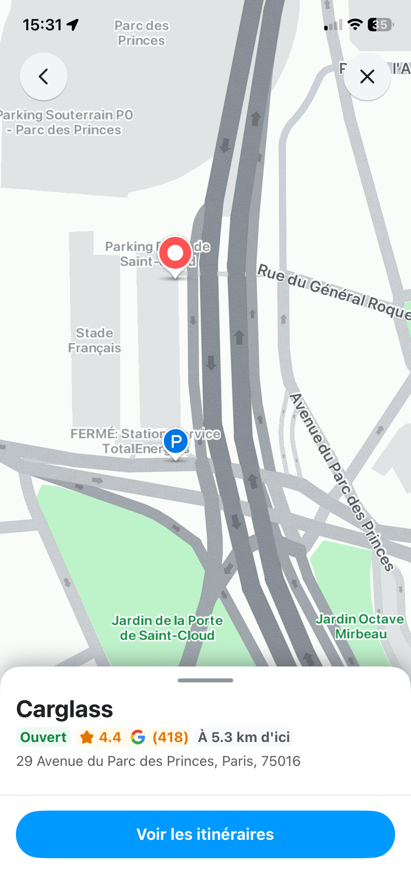Lors d’une recherche sur Waze en mobile pour l’adresse 29 avenue Parc des Princes, 75016 Paris, l’emplacement sur la carte est erroné : le pin se situe au niveau du numéro 1 de l’avenue Parc des Princes (Collège et Lycée Claude Bernard) (cf. copie-écran no. 1 et 2) au lieu de l’emplacement de la société Carglass, au niveau du parking Indigo de la Porte de St Cloud (cf. copie-écran no. 3) :