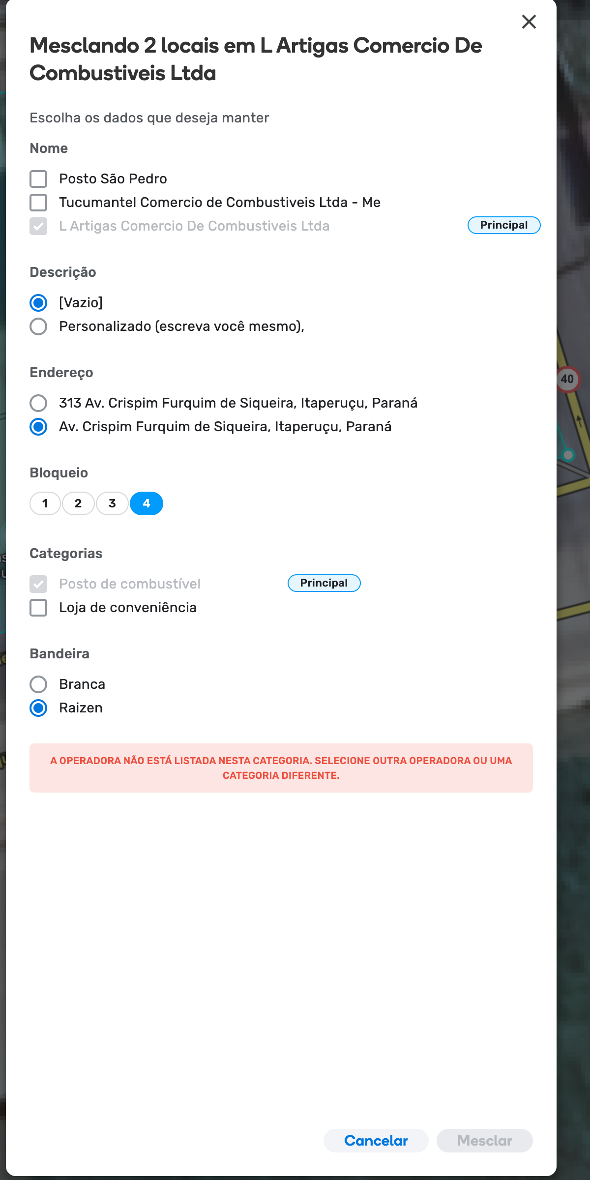 Um ponto importante para a mesclagem de Places é a Bandeira pois a importação trouxe como “Branca” mas depois passou a ser usado como “Bandeira Branca”, gerando também o aviso de erro e impedindo a mesclagem.