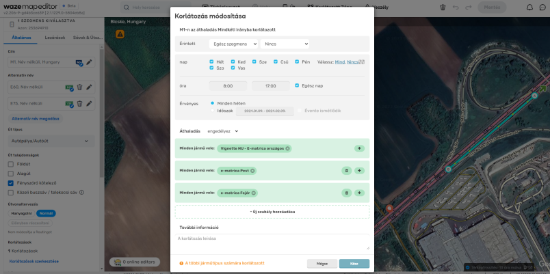 A matricákat korlátozásként kell a díjköteles szegmensekre megadni, az egyszerűség kedvéért a díjköteles utakra a korlátozást mindig kétirányú korlátozásként rögzítjük. Amennyiben felkészülünk az újonnan díjkötelessé váltó szakaszokra, akkor a kezdőnappal egy hosszabb időszakot (pl év vége) adunk meg, minden más esetben az Érvényes pontban “Minden héten” beállítást válasszuk.