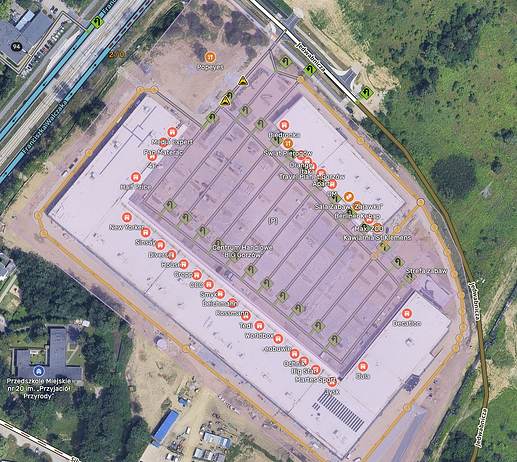 - Dla rozległych, jednopoziomowych Centrów Handlowych umieść Punkty w miarę blisko faktycznej lokalizacji. W ten sposób użytkownik dowie się, w którym miejscu Punkt się znajduje a aplikacja wybierze Parking najbliższy lokalizacji Punktu.