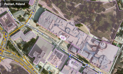 Miejsce w postaci Obszaru jest przedstawiane w postaci wielokąta, którego kształt można skorygować poprzez przesuwanie węzłów geometrii (identycznie jak w przypadku segmentów dróg). Wszystkie Obszary niezaznaczone w edytorze są koloru różowego, zaznaczone - niebiesko-zielonego a po zmianie (przed zapisaniem) przyjmują barwę czerwonawą: