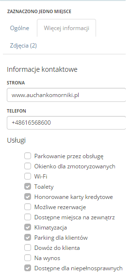 Ta zakładka zawiera inne, przydatne informacje nt. Miejsca, takie jak numer telefonu, strona i dodatkowe usługi.