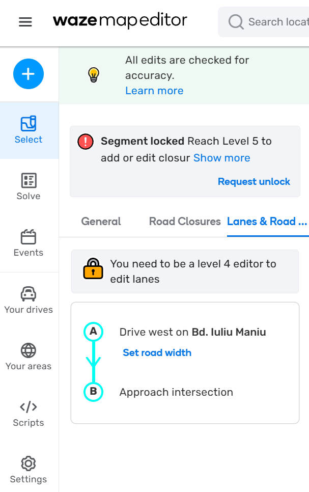 WME shows the message “You need to be a level 4 editor to edit lanes”