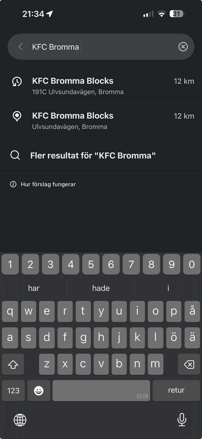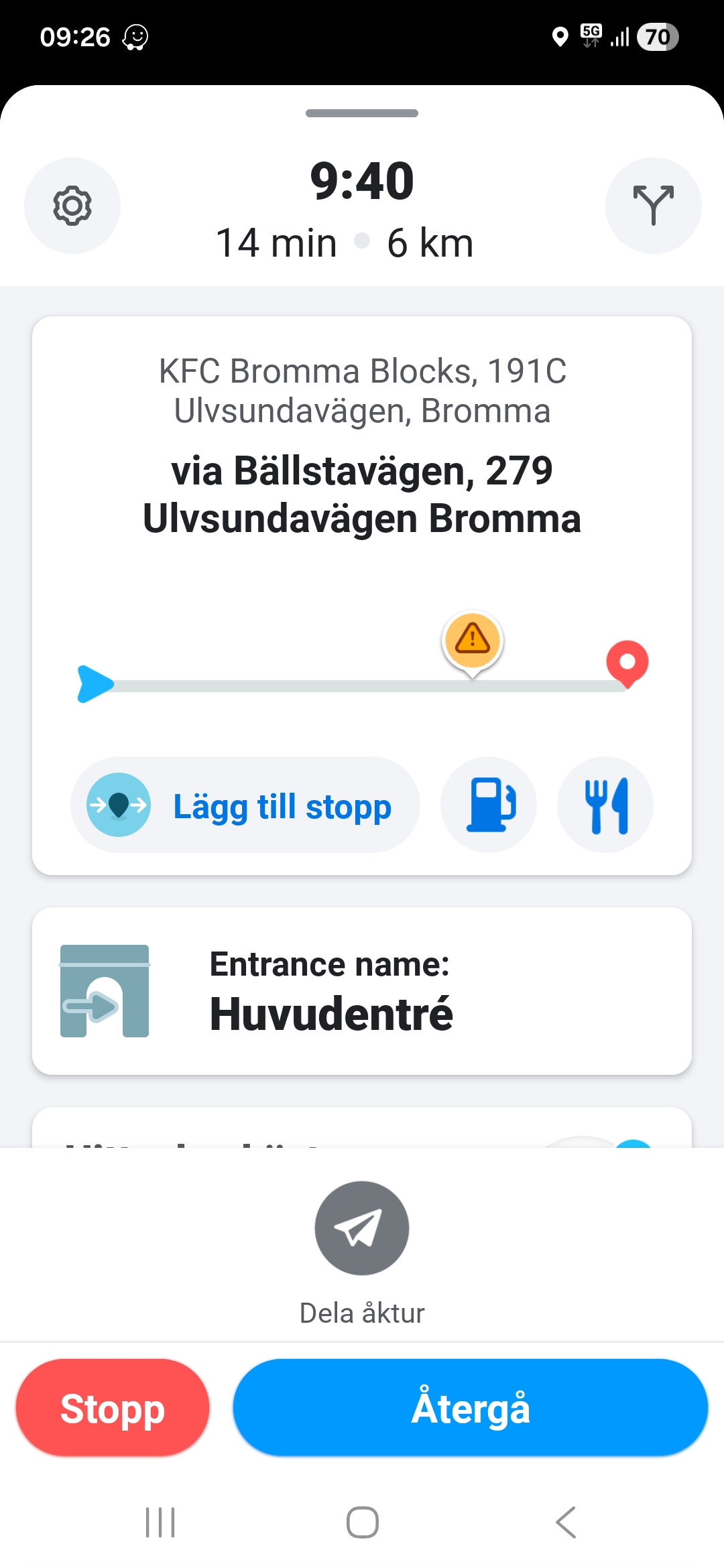 Om jag väljer rutt till KFC Bromma Blocks kommer man till Huvudentrén som pnylin visade, se bild 1. Om jag klickar på ikonen “Huvudentré” får jag upp två val, “Huvudentré” och “Drive in”, se bild 2. Väljer jag “Drive In” blir jag ändå ruttad till huvudentrén.