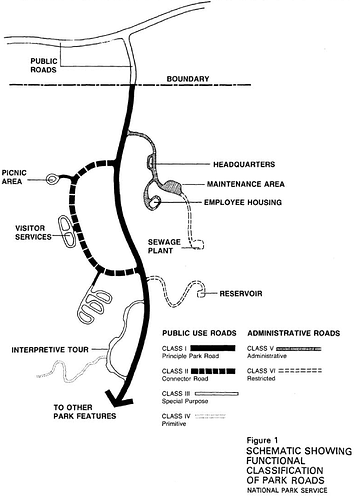 Special Purpose Park Road | Street | Roads which provide circulation within public use areas, such as campgrounds, picnic areas, visitor center complexes, concessioneer facilities, etc. These roads generally serve low·speed traffic and are often designed for one-way circulation. |