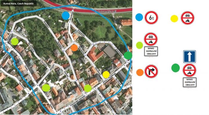 V označené oblasti jsou dopravní značky umístěny, jak je ukázáno na obrázku. Vzhledem k tomu, že většina značek zakazuje vjezd mimo dopravní obsluhu, není žádoucí přes danou oblast navigiovat pro průjezd, i když podle dopravního značení je možné oblast nejen projet, ale dokonce bez porušení předpisů vyjet zákazem vjezdu motorových vozidel. Značka zákaz odbočení vpravo uprostřed oblasti tomu nezabrání, její význam se marně snažím pochopit.