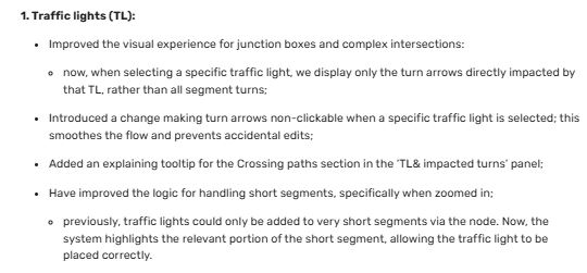 previously, traffic lights could only be added to very short segments via the node. Now, the system highlights the relevant portion of the short segment, allowing the traffic light to be placed correctly.