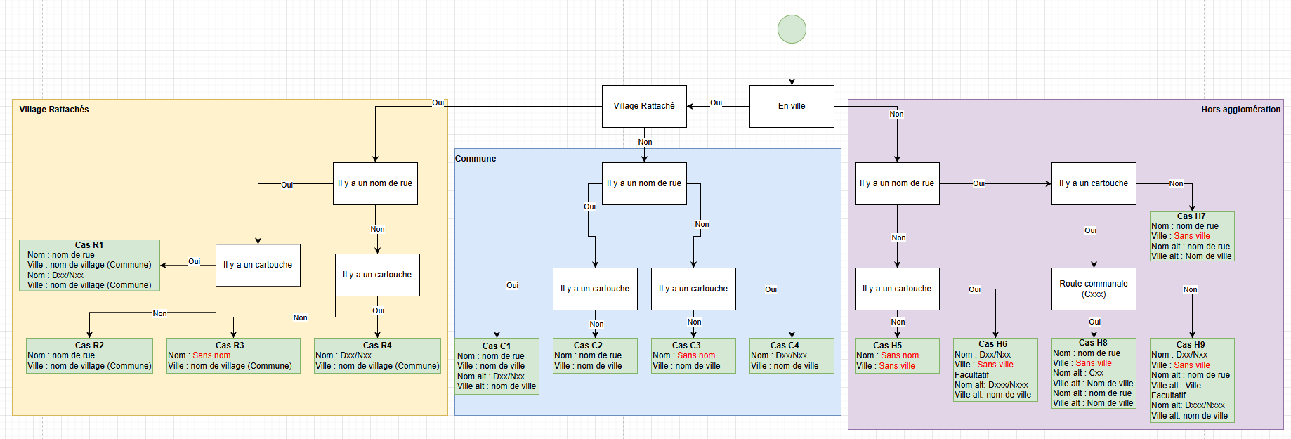 Cas 1 : il s’agit d’une rue avec une adresse. Le nommage se fait en ville ou hors agglomération comme au dessus. Ils ammèneront à une adresse.