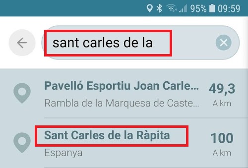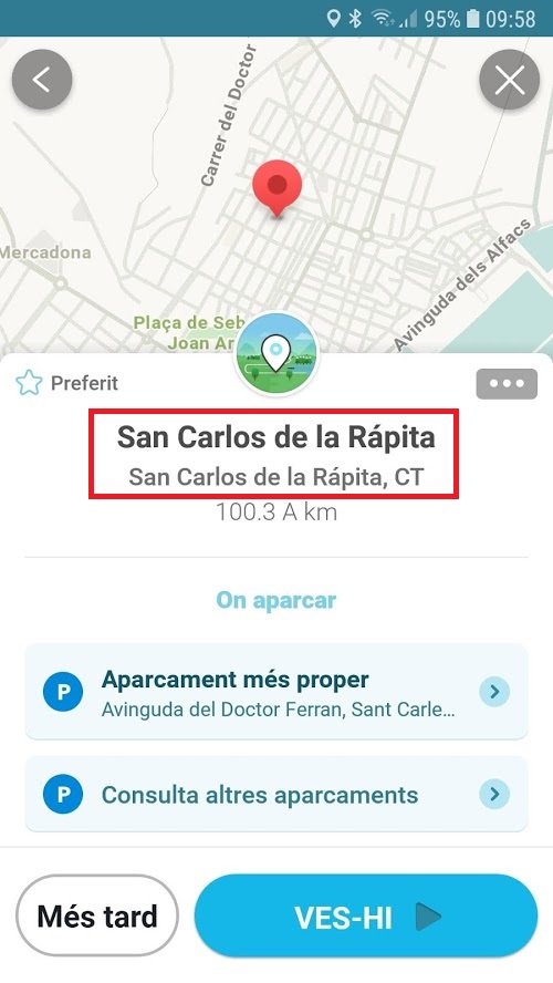 Per la meva sorpresa, al fer una cerca, malgrat fer-la en català i inclús mostra’n la ubicació al mapa en català, la indicació del nom al waze és en castellà en lloc del nom nadiu. :shock: