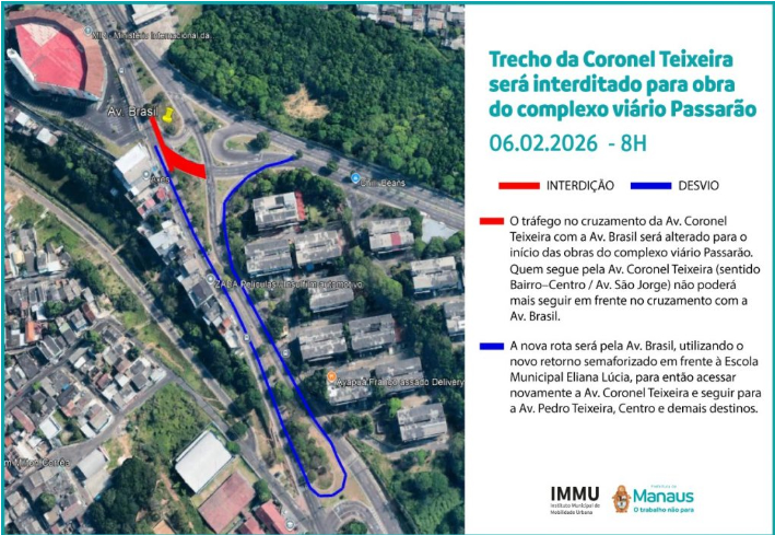 A Prefeitura de Manaus informa que, a partir desta sexta-feira, 6/2, às 8h, o tráfego no cruzamento da Av. Cel. Teixeira com a Av. Brasil passará por alterações para a realização das obras do complexo viário Passarão.