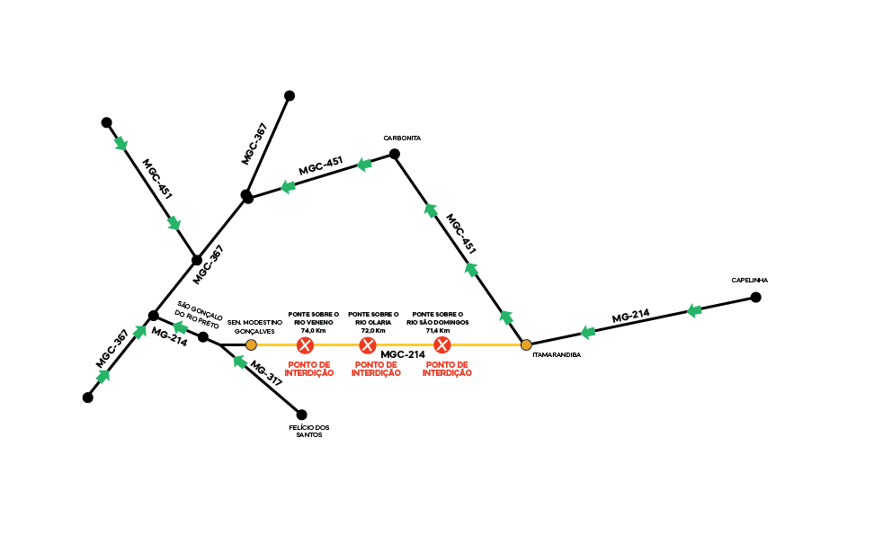 “O DNIT alerta para liberação temporária da BR-354 no km 768, próximo à cidade de Itamonte. A liberação, somente para veículos de passeio, será a partir de 23h59min desta sexta-feira (28), e se estenderá até a quinta-feira (6) às 6 horas. Nesse período, equipes do DNIT permanecem atuando no trecho, que estará devidamente sinalizado. Demais veículos devem seguir as rotas indicadas pelo DNIT.”