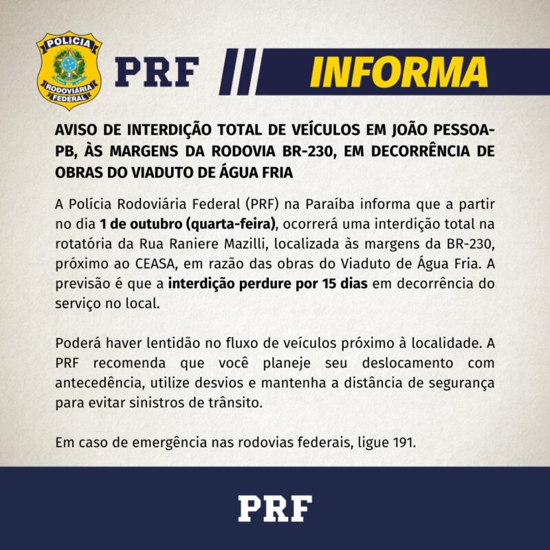 Achei esse comunicado da PRF num site de notícias, mas não vi na própria PRF.