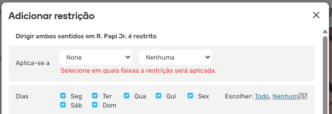 Veja a sugestão no Uservoice: exibir aviso ao adicionar restrições (ônibus, HOV etc.) que se aplicam a todas as faixas