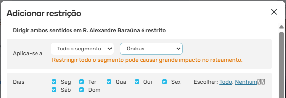 - Um aviso é exibido ao aplicar restrições de alto impacto (Faixa de ônibus, HOV, etc.) ao segmento inteiro.