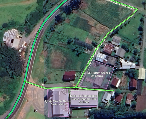Neste outro caso, a escola fica paralela, mas em uma outra via de terra, à BR-470. Não tem placa na BR sobre escola, mas o caminho óbvio seria o trânsito para a BR, onde existe a parada de ônibus.