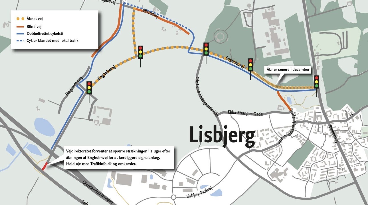 Engholmvej er en 2,5 km lang ringvej mellem Randersvej og Søftenvej. Den nye vej skal lede den tunge trafik uden om Lisbjerg ![]()