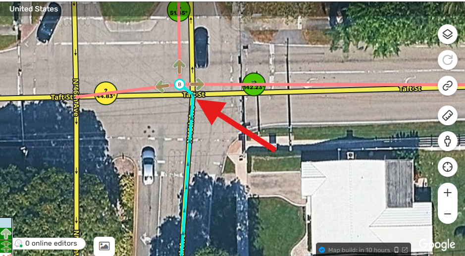 This is an issue that is been around for sometime, the geonode appears under the main node of the junction creating a small turn, you can only find it when you see the Arrows pointing to a different direction, i just fix one of those cases, then you moved the main junction and find out that there is a geonode under it and this causes and issue in the main junction.