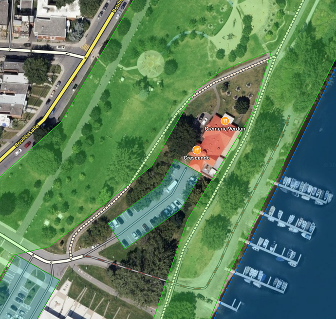 As a destination, Crémerie Verdun will snap to the walking trail through the park and users routed there will be sent to where that walking trail attaches to a drivable road instead of to the shop’s parking-lot road.