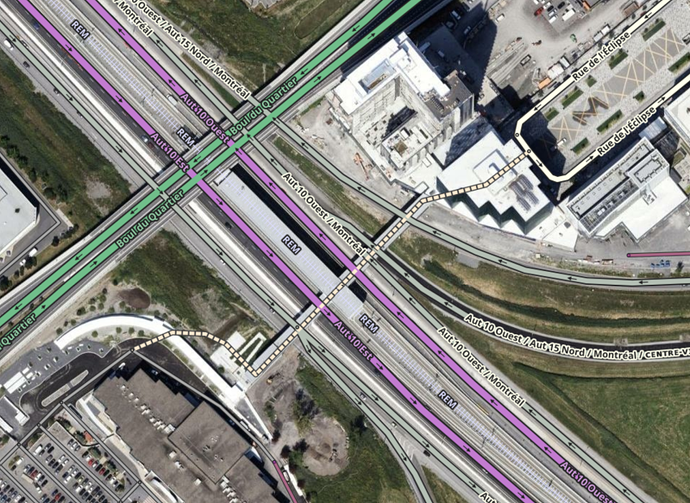 This commuter-rail station in Brossard, Que. sits in the middle of a freeway. Without a walking trail, Waze would send users navigating to the train station to the closest freeway point. With a walking trail for the station to snap to, Waze instead sends users to the appropriate local/parking roads.