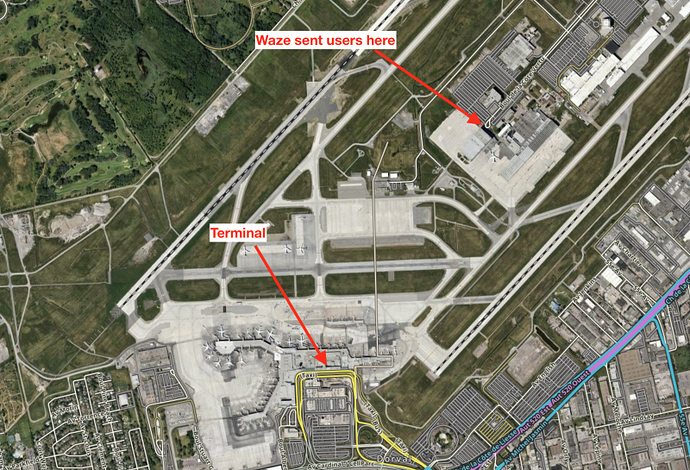 Map editors can use walking trails to compensate for this error. The first step is to open Google Maps and see where that places the pin. Let’s look at Montreal-Trudeau International Airport, which is known to succumb to this error. Waze would send users to the middle of this vaguely U-shaped airport, which is a hub for aviation businesses that offer no public access to the airport.