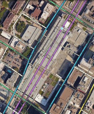 Similarly, Rue St-Antoine Ouest in Montreal was closed for six months by a work site of trenches and fences. Not even pedestrians could cross from one side of the street to the other. Users reported that Waze was directing them to the wrong side of the street for a chosen destination. Walking trails “intercepted” the snapping to the side streets and enforced routing to the correct side of the closed street. Note that in this case, the walking trails were named “Rue St-Antoine Ouest”.