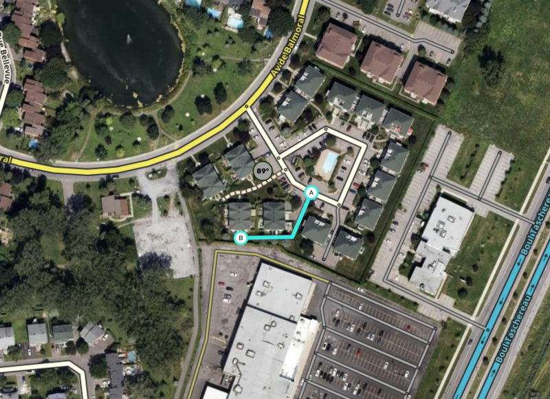 Residential developments sometimes use street addresses that are not on the actual street. Users wanting to go to those addresses can be sent t the wrong side of the complex or even to a completely different street. This residential complex in Edmonton uses walking trails to direct users to the correct parking-lot road for each address. This walking trail attached to Mackle in Côte-St-Luc, Que. prevents users from being sent to Lismer instead.