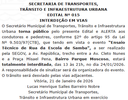 Nome do Evento: Ensaio Técnico de Rua da Escola de Samba Categoria do Evento: Desfiles (Ensaio Técnico) Cidade: Vitória Data: 24/01/2026 Hora Início do Evento: 13:00 Hora Final do Evento: 21:00 Permalink: Av. República, trecho entre a Av. Cleto Nunes e a Praça Misael Pena, Bairro Parque Moscoso, estará totalmente interditada, das 13 às 21h, no dia 24/01/2026. Fonte Oficial: Diário Oficial do Município de Vitória, Edição 2808, de 22 de janeiro de 2026, página 7.