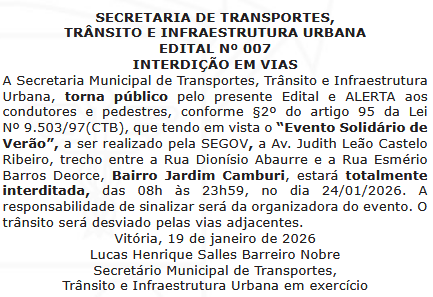 Nome do Evento: Evento Solidário de Verão Categoria do Evento: Outros (Evento Solidário) Cidade: Vitória Data: 26/01/2026 Hora Início do Evento: 08:00 Hora Final do Evento: 23:59 Permalink: Av. Judith Leão Castelo Ribeiro, trecho entre a Rua Dionísio Abaurre e a Rua Esmério Barros Deorce, Bairro Jardim Camburi, estará totalmente interditada, das 08h às 23h59, no dia 24/01/2026. Fonte Oficial: Diário Oficial do Município de Vitória, Edição 2808, de 22 de janeiro de 2026, página 7.