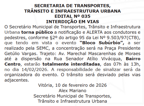 Nome do Evento: Bloco Subúrbio Categoria do Evento: Bloco Carnaval Cidade: Vitória Data: 14/02/2026 Hora Início do Evento: 07:00 Hora Final do Evento: 13:00 Permalink: Concentração será na Praça Presidente Getúlio Vargas. Trajeto: Av. Marechal Mascarenhas de Moraes até a dispersão na Rua Senador Atílio Vivácqua, Bairro Centro, estarão totalmente interditadas, das 07h às 13h, no dia 14/02/2026. Fonte Oficial: Diário Oficial do Município de Vitória, Edição 2824, de 12 de fevereiro de 2026, página 20.