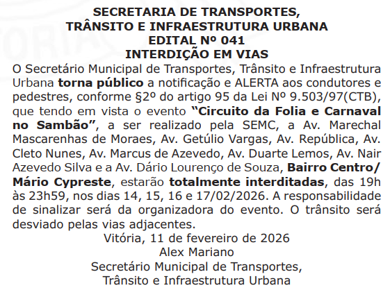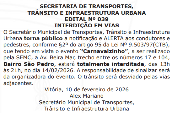 Nome do Evento: Carnavalzinho Categoria do Evento: Bloco Carnaval / Carnaval Cidade: Vitória Data: 14/02/2026 Hora Início do Evento: 13:00 Hora Final do Evento: 21:00 Permalink: Av. Beira Mar, trecho entre os números 17 e 104, Bairro São Pedro, estará totalmente interditada, das 13h às 21h, no dia 14/02/2026. Fonte Oficial: Diário Oficial do Município de Vitória, Edição 2824, de 12 de fevereiro de 2026, página 20.