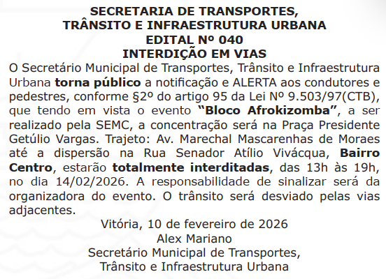 Nome do Evento: Bloco Afrokizomba Categoria do Evento: Bloco Carnaval Cidade: Vitória Data: 14/02/2026 Hora Início do Evento: 13:00 Hora Final do Evento: 19:00 Permalink: Concentração será na Praça Presidente Getúlio Vargas. Trajeto: Av. Marechal Mascarenhas de Moraes até a dispersão na Rua Senador Atílio Vivácqua, Bairro Centro, estarão totalmente interditadas, das 13h às 19h, no dia 14/02/2026. Fonte Oficial: Diário Oficial do Município de Vitória, Edição 2824, de 12 de fevereiro de 2026, página 20.