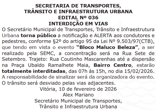 Nome do Evento: Bloco Maluco Beleza Categoria do Evento: Bloco Carnaval Cidade: Vitória Data: 15/02/2026 Hora Início do Evento: 07:00 Hora Final do Evento: 15:00 Permalink: Concentração será na Rua Sete de Setembro. Trajeto: Rua Coutinho Mascarenhas até a dispersão na Praça Ubaldo Ramalhete Maia, Bairro Centro, estarão totalmente interditadas, das 07h às 15h, no dia 15/02/2026. Fonte Oficial: Diário Oficial do Município de Vitória, Edição 2824, de 12 de fevereiro de 2026, página 20.