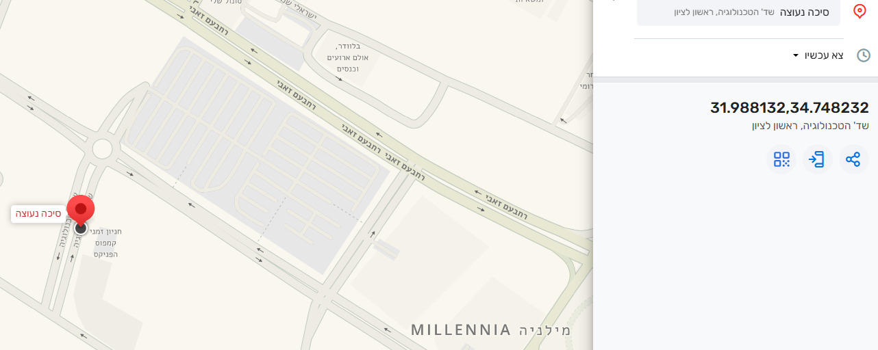 כשמזינים את השם RISHO ב-WAZE זה בסדר שזה מוביל לאיפה שמיקמתם את זה כי זה החניון שיש שם כרגע (חניון למבקרים באתר הבנייה - זה סמוך לנקודה “חניון זמני קמפוס הפניקס”.