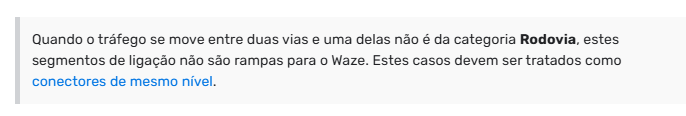 Rampas tem uma função muito específica no Waze. Seu propósito é conectar as vias Estadual (Minor Highway), Federal (Major Highway) e Expressa (Freeway) entre si quando elas se ligarem de forma diferente de um cruzamento de nível.