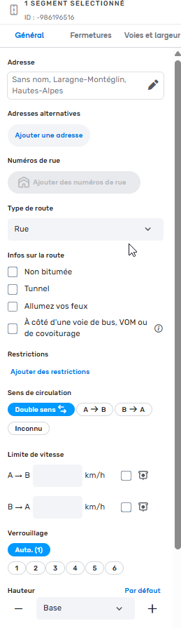 | Remplissez ces informations en fonction de ce que vous souhaitez obtenir : Une route à double sens de circulation, une voie de parking à sens unique, etc… Le raccourci clavier pour changer le sens de circulation est la touche R (après avoir sélectionné le segment). La hauteur sert lorsqu’une route passe au-dessus d’une autre (pont et tunnel). Dans ce cas, la route supérieure doit être mise à l’élévation 1. Le verrouillage permet de protéger un segment. Seuls les éditeurs ayant au moins le niveau indiqué pourront éditer ce segment. N.B. :