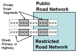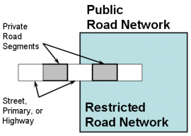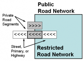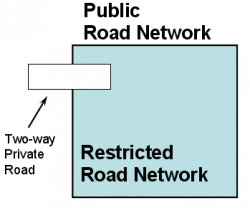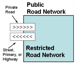 Many larger military bases and perhaps other private installations sometimes have long right-of-way permissions for a publicly accessible road, often times this is a highway or primary street. (e.g., US-70 through White Sands Missile Range.) These highways run across the private installation with no restriction to traffic but provide no access to the installation itself. Editors should not create any access restrictions in these regions. Because these roads are often times fenced off on both sides from the private installation, editors should be on the look out for private installation roads inappropriately connected to the public road. These are usually locked off by gates most of the time, in which case the road can be disconnected or have a gap. Some of these are entry/exit gates with treatments noted above.