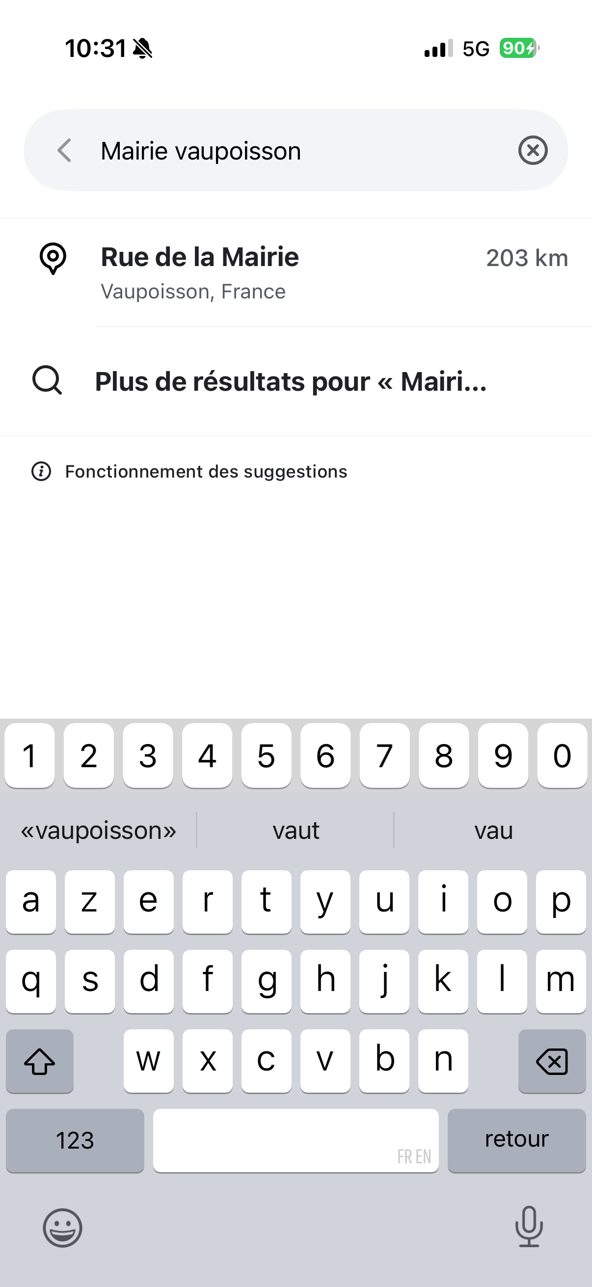 Voici ce qui apparaît lorsque l’on fait la recherche dans l’application. Il s’agit de la même problématique, il n’y a qu’un résultat GMaps qui renvoit sur une rue et non pas l’établissement Mairie.