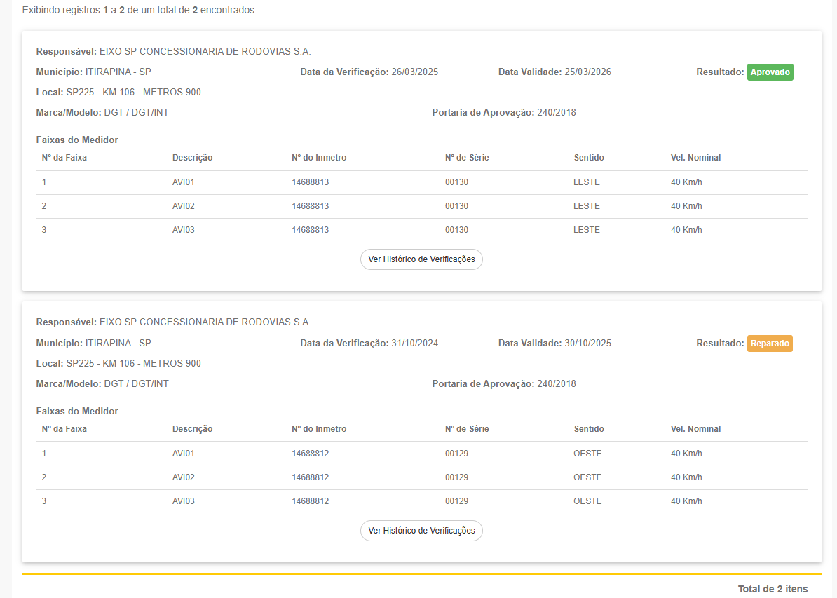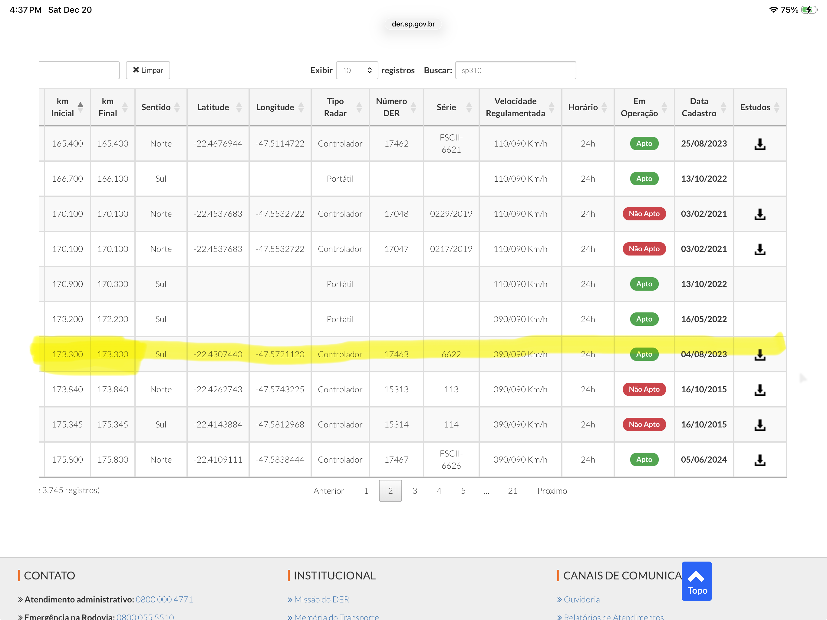 O site do DER-SP não está atualizado com as novas informações de radares e nomenclaturas de rodovias atualizadas. Neste caso, deve seguir a consulta do radar somente pelo INMETRO por enquanto.