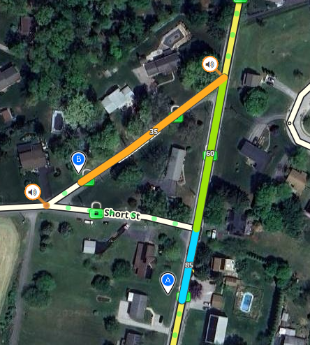 I created a second route and compared the amount of time it takes to make each left turn. The left turn onto Short St. is faster and would most likely be offered first over the sharp left.