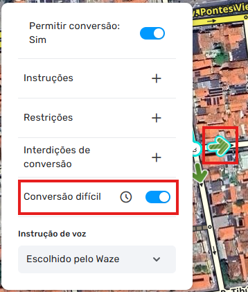 No menu de conversão, há uma caixa de marcação para Conversão Difícil. Ao marcá-la, o servidor de rotas penalizará essa manobra adicionando 7 minutos ao percurso. Utilize essa função em locais de difícil travessia, principalmente se representarem risco ao usuário.