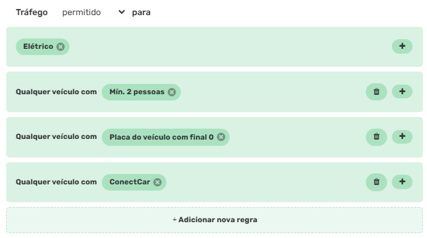 Para um restrição de permissão específica de tráfego, podem ser utilizados um ou mais critérios para definir e restringir o roteamento pelo segmento ou conversão. Nesta opção a restrição de tráfego aparecerá na cor verde.