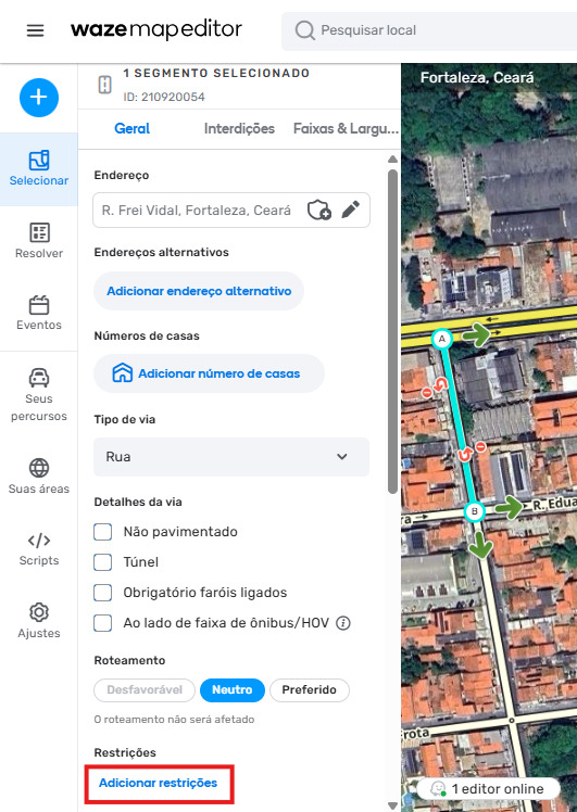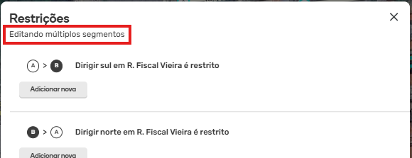 É necessário criar uma restrição específica para cada sentido, se houver diferenças entre elas. Observe cautelosamente se as aplicações ocorreram no(s) sentido(s) desejado(s), visto que a restrição aplicada incorretamente não produzirá os efeitos no mapa. Por exemplo, se o sentido do segmento for A>B e uma restrição for criada para o sentido B>A, o efeito prático será nulo. Em compensação, se a restrição para o mesmo segmento de sentido A>B for criado como “Mão dupla” ou A>B, os resultados serão alcançados como esperado.