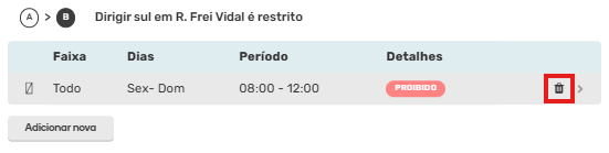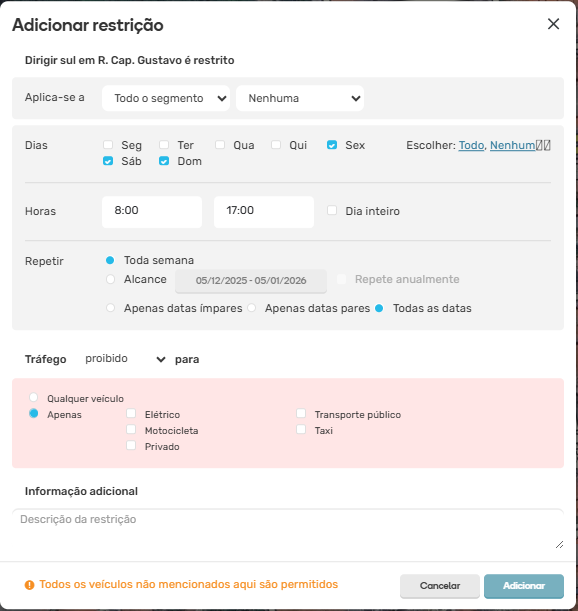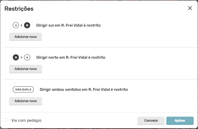 Após configurar a restrição, pressione o botão “Adicionar” na parte inferior da interface para salvar e retornar ao painel de restrições. Continue adicionando da mesma maneira, caso existam restrições com características diferentes no mesmo trecho.