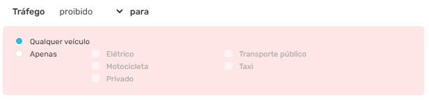 A condição padrão, ao criar uma restrição de proibição de tráfego, inclui somente a opção tipos de veículos. Em outras palavras, quando um tipo está marcado neste formato, ele será impedido de trafegar no período da restrição. Portanto, ao configurar uma restrição com este modo, certifique-se de selecionar os tipos de veículos corretamente. Nesta opção a restrição de tráfego aparecerá na cor vermelha.