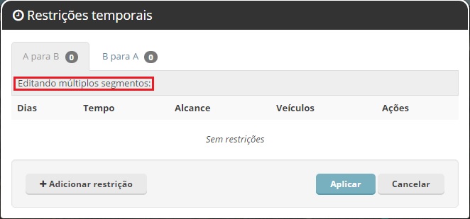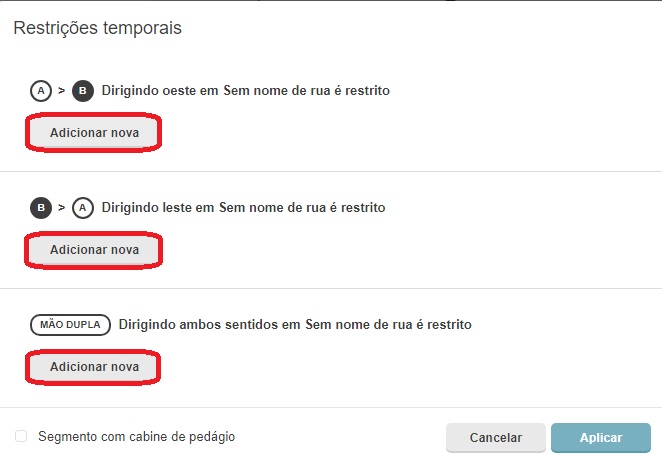 Isso dá acesso ao painel de “restrições temporais ou baseadas no tempo”. A tela mostra três seções de restrição “A para B”, “B para A” (que são as letras utilizadas para determinar o sentido de tráfego dos segmentos) e ainda “Mão dupla”.