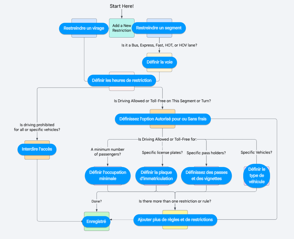 Les voies réservées doivent être cartographiées en utilisant le type de voie correspondant à leur classification. Vous devrez ensuite utiliser les restrictions programmées sur le type de véhicule : Transports publics et/ou Taxi.